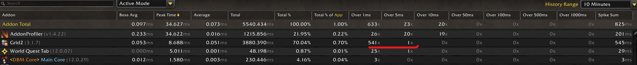 Grid2 has always had low CPU usage and I have never had issues with it for 10+ years. I have started getting some small lagspikes so I decided to monitor my addon and I can see that gird has started getting alot of 1ms and a couple of 5m and 10ms spikes. I also see the addon cpu usage jump from < 0.5 cpu% to up to 4-5% cpu usage during many fights.This has never been the case before, I am not sure if this has been going on for awhile either since midnight release, because of a recent patch or because of a update to the addon?
